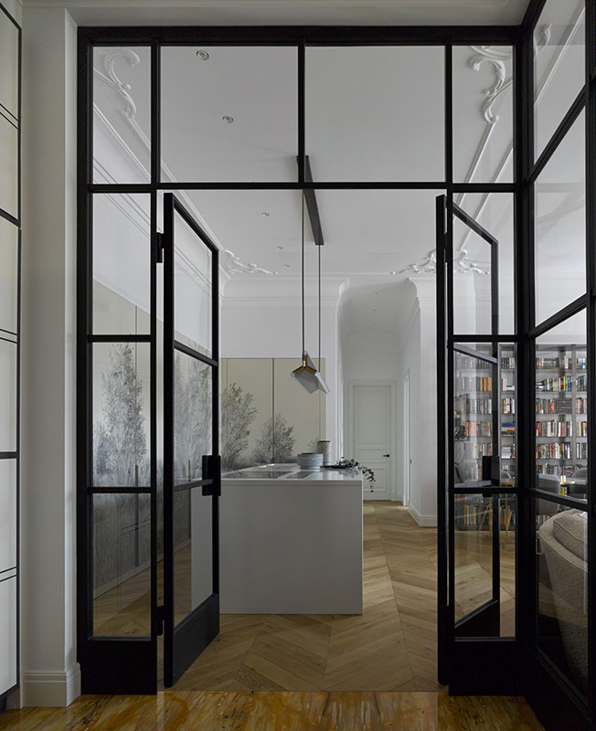 Екатерина Дементьева спроектировала квартиру 75 кв. метров в московском ЖК Redside. Кухня отделена от гостиной раздвижной перегородкой, что позволяет варьировать планировку. Декор стен согласован с членением фасадов кухни Aster Сucine.