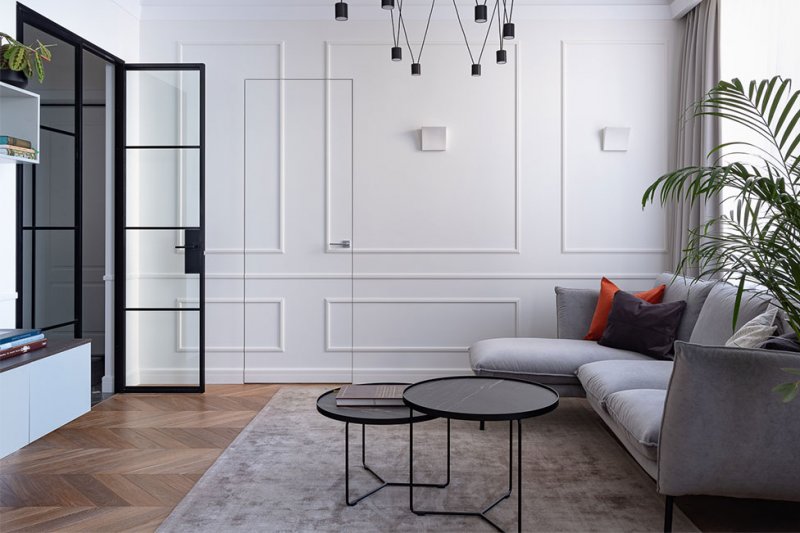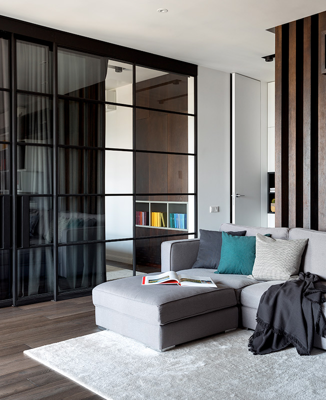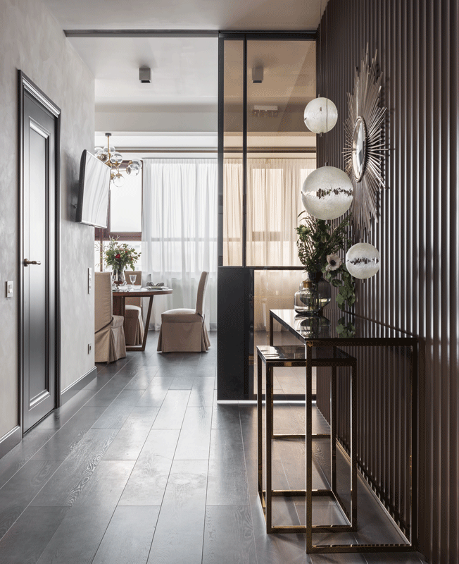 Наталья Соло: перепланировка квартиры для семьи с двумя детьми. Легкими стеклянным перегородкам разграничили пространство кухни-гостиной. Аналогичными — отделили коридор от общественной зоны.