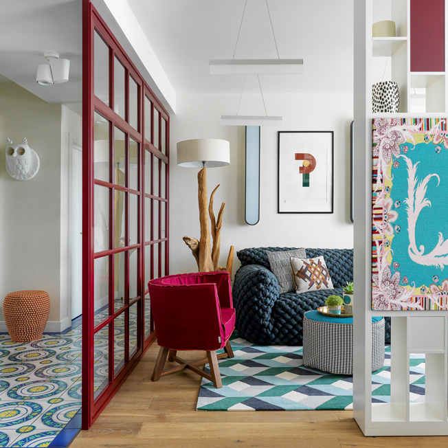 Дарья Василькова: яркая квартира 70 кв. м. Перегородки выбрали прозрачные или условные, чтобы не загромождать интерьер и не лишать его естественного света. Гостиная отделена от коридора стеклянной перегородкой, а от столовой — поворотной стойкой с телевизором.