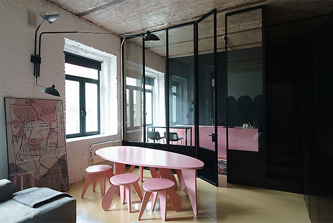Гарри Нуриев. Перегородка из стекла и дерева выделяет кухню, спальное место отгорожено ширмой. Наливной полимерный пол объединяет пространство лофта.