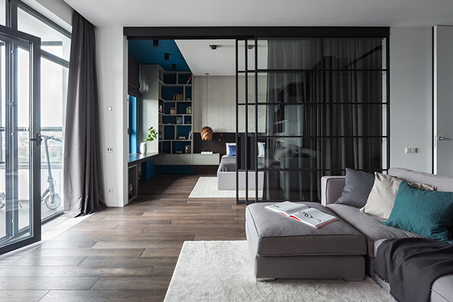 Раздвижные или стационарные лофт-перегородки стали популярным решением. Их преимущество — тонкий профиль и возможность сделать все помещение или его часть хорошо освещенным дневным светом.