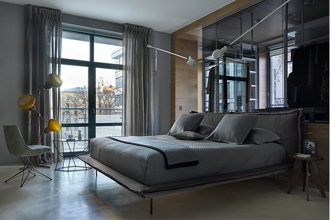 Domestic Studio. Гардеробная расположена за перегородкой из стекла. Кровать, торшер, столик, кресло Arketipo, прикроватные столики Vitra. Настенный светильник Flos дизайна Паоло Риццато — культовая модель 1973 года.