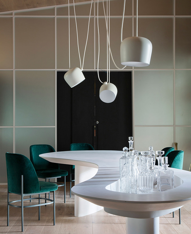 Лофт Нильду Жозе: «Архитектура должна дышать, рассказывать историю и стать ландшафтом для счастливой жизни». Зону «есть/пить» маркирует крупный стол из белого композита, созданный специально для лофта: с одной его стороны устроена столовая, с другой — бар.