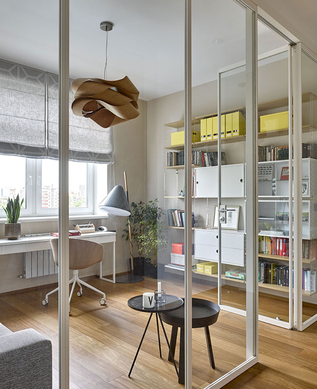 Domestic Studio: квартира с яркими идеями и скандинавским дизайном. Благодаря прозрачной перегородке, свет из кабинета проникает в коридор. Столик Hay. Торшер и кресло Bolia, стеллаж String. Подвесной светильник из скрученного шпона LZF.