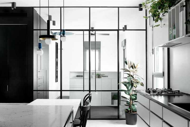 Studio ETN: черно-белый интерьер в Яффе. В квартире отказались от сплошной стены между кухней-гостиной и спальней. Ее заменила прозрачная перегородка на черном металлическом профиле, благодаря которой спальня визуально продолжает общее пространство.