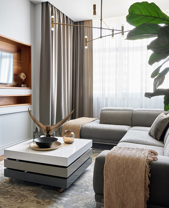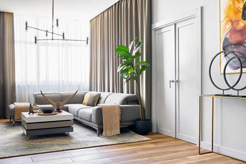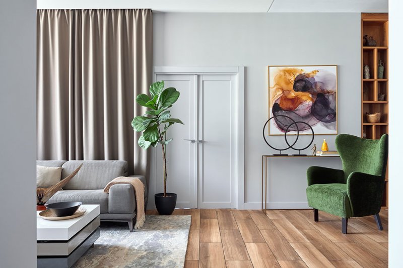 Основой палитры стал нейтральный светло-серый цвет, в который выкрашены стены во всей квартире, межкомнатные двери, стеновые панели в гостиной, прихожей и фасады кухни. Это своего рода основа, с которой хорошо работают различные фактуры и цвета. Дополнительные оттенки – природные, такие как зеленый, медовый, голубой.