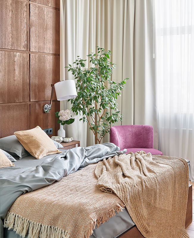 Фрагмент главной спальни. Кровать BoConcept. Светильники SLV. Стена за кроватью оформлена панелями в шпоне ясеня.