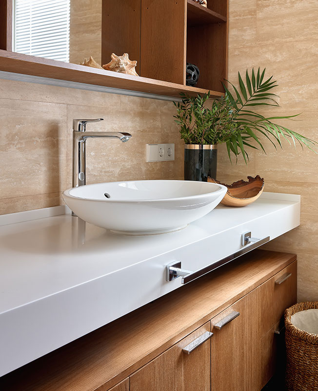 Ванная комната. Стены выполнены из травертина. Сантехника Villeroy&Boch. Краска Caparol.