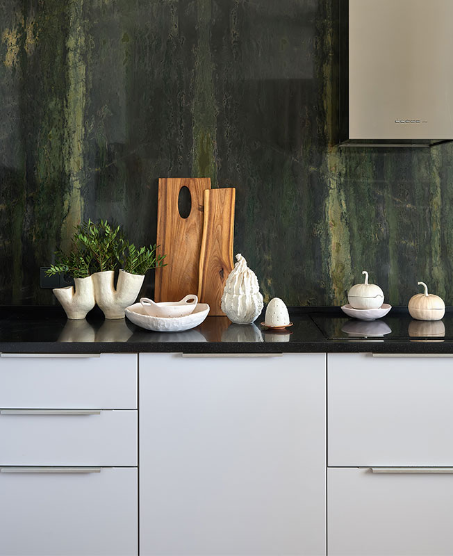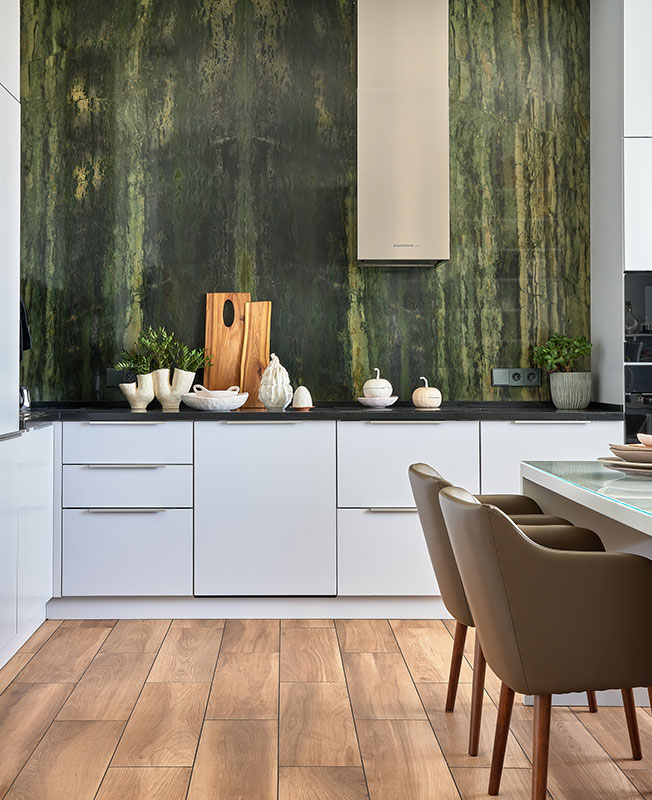 Фрагмент кухни. Гранит на фартуке Green Bamboo. Вытяжка Falmec.