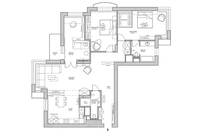 «Первое, что замечаешь, когда попадаешь в квартиру — это обилие света. Нескольким комнатам отдельно повезло. В гостиной и главной спальне окна были угловыми, а в гостевой — еще и в пол», — комментируют проект Ольга и Александра.