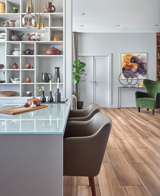 Вид из кухни на гостиную. Стеллаж изготовлен на заказ по эскизам авторов проекта. Кресло Horeca Master. Керамогранит Porcelanosa.