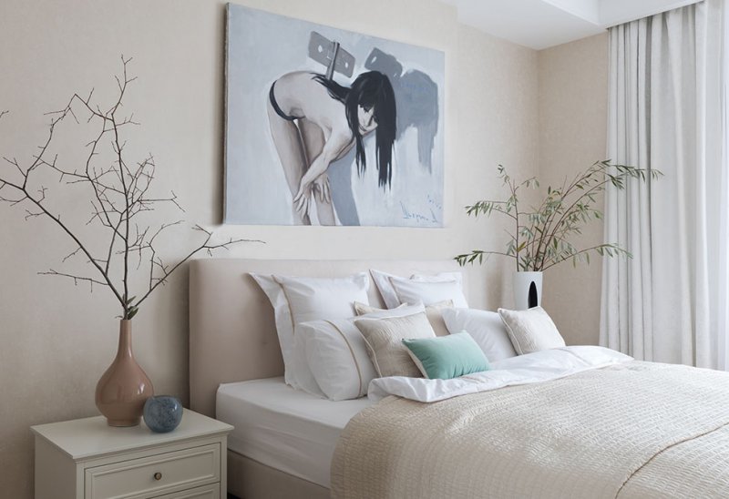 Спальня. Прикроватная тумба изготовлена на заказ по эскизам автора проекта. Обои Khroma. На стене работа Дмитрия Шорина, галерея fine ART. Текстиль Zara Home.