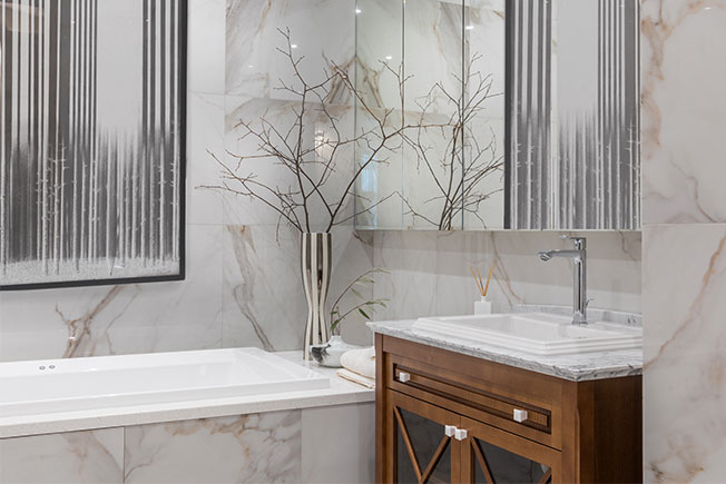 Ванная комната. Тумба изготовлена на заказ по эскизам автора проекта. Керамогранит Grespania. Смесители Hansgrohe. Сантехника V&B. Текстиль Zara Home. На стене работа Тимофея Смирнова.