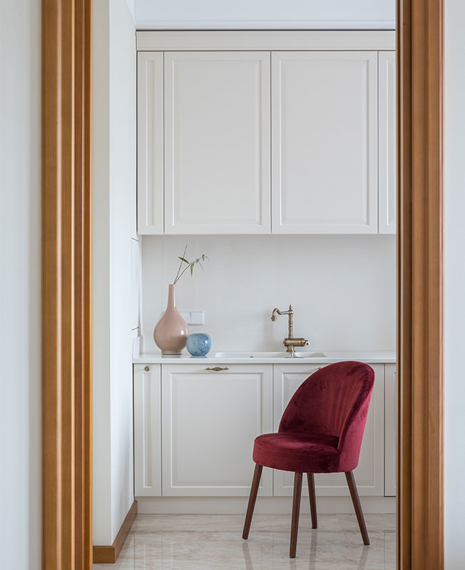 В квартире сформировали парадную гостиную, просторную кухню-столовую, кабинет, спальню, гардеробную, постирочную, ванную комнату и санузел. Также одной из основных задач для автора проекта было создать интерьер, который был бы практичен и легок в использовании.