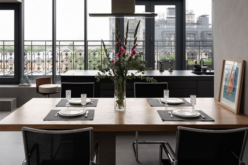 Зона столовой. Стол изготовлен на заказ по эскизам автора проекта, стулья Lema. На столе работа художника и архитектора Вячеслава Хомутова.