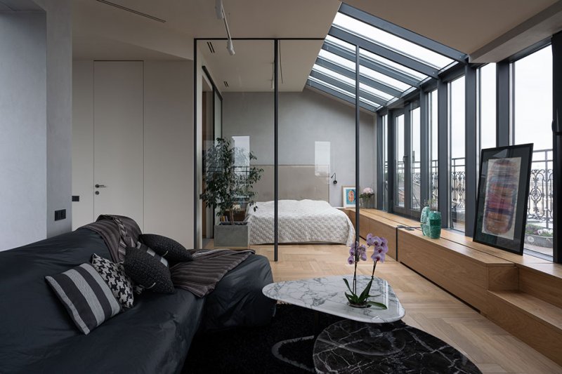 Вячеслав не стал дробить пространство 109 кв. метров на изолированные комнатки. Даже такое приватное помещение как спальню отгородили от общей зоны номинально — при помощи стеклянных стен. В ванную комнату при этом ведет откатная дверь.