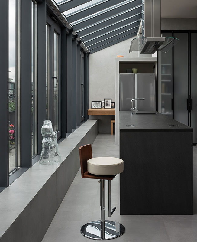 Кухня Leicht с интегрированной варочной поверхностью Ligron tech. Скульптура Сергея Борисова. Барный стул Le Spighe, диз. Клаудио Сильвестрин, Poltrona Frau.
