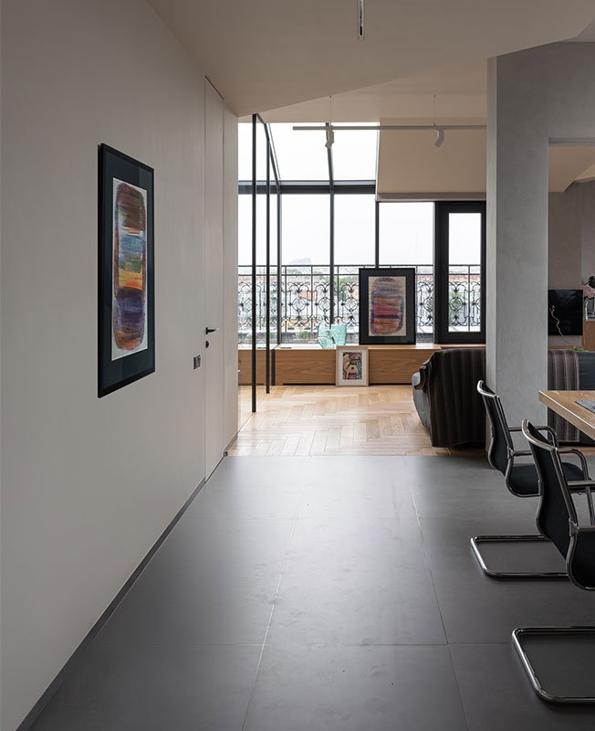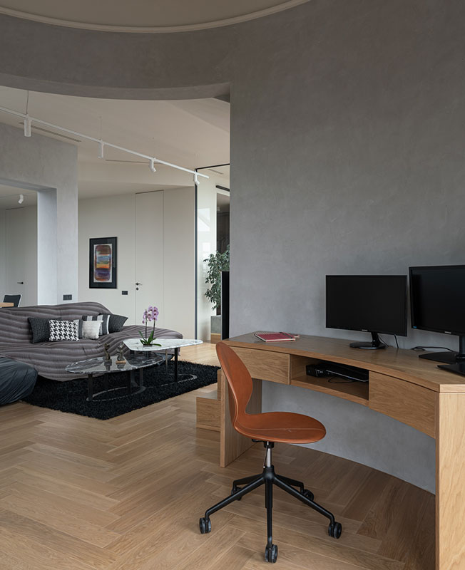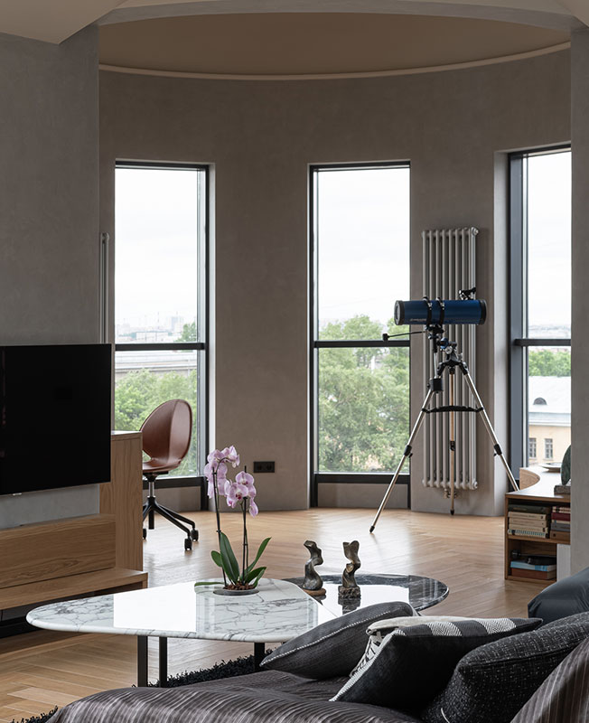 Интерьер решен в духе минимализма, чтобы ничего не отвлекало от панорамы города — бетонные стены, керамогранит и паркет. Первое, что видят гости при входе в квартиру — это кухонный остров со столовой зоной. Далее разворачивается пространство гостиной и спальни. В круглой башенке расположился кабинет. Инженерные коммуникации спрятаны в короб у окна — излюбленное место для любования закатов всех гостей этого дома.