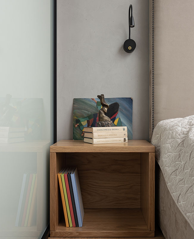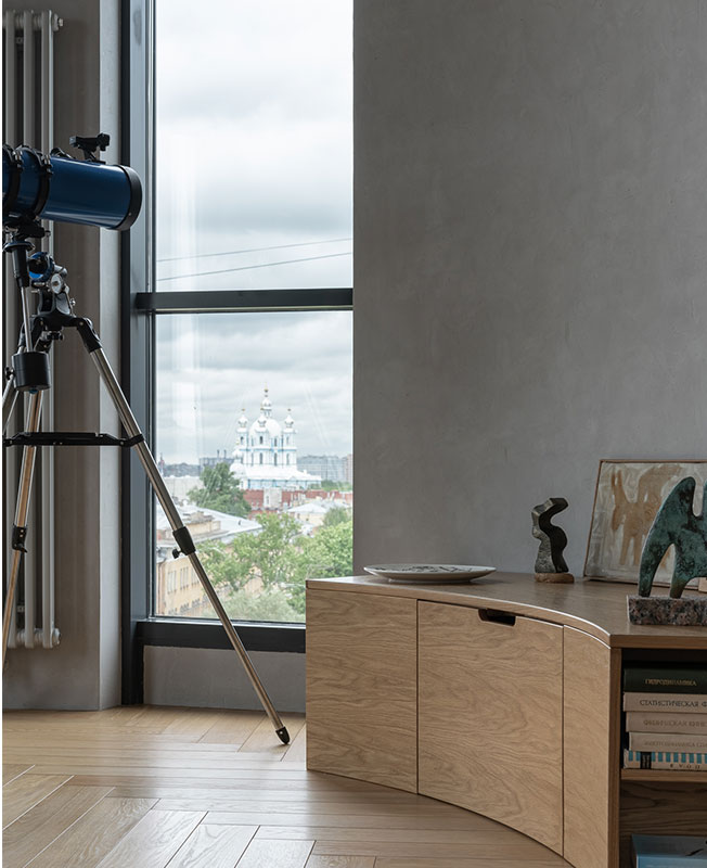 Кабинет. Кресло с банкеткой Genni, диз. Габриэле Муччи, Zanotta. Рабочее кресло Basil, Calligaris. Заказчики — ученый и владелица коммуникационного агенства, мечтали жить в центре Санкт-Петербурга рядом с Таврическим садом, видом на Смольный собор, возможно на последнем этаже и с собственной террасой. Также заказчики рассматривали жилье только в новостройке, но в духе старых петербургских домов. Решение о покупке было принято мгновенно, когда была найдена квартира с угловой башенкой. Изначально владелица собиралась сама разрабатывать дизайн-проект: «В этой иллюзии я пребывала до момента окончания строительства самого дома. После первой встречи с квартирой, решение о приглашении профессионального архитектора также было принято единогласно», — рассказывает о проекте владелица. Заказчики обратились за помощью к другу семьи Вячеславу Хомутову, шефу–архитектору бюро Haubaus. Зона столовой. Стол изготовлен на заказ по эскизам автора проекта, стулья Lema. На столе работа художника и архитектора Вячеслава Хомутова. Зона гостиной и спальни. Картина художника и архитектора Вячеслава Хомутова. Вячеслав не стал дробить пространство 109 кв. метров на изолированные комнатки. Даже такое приватное помещение как спальню отгородили от общей зоны номинально — при помощи стеклянных стен. В ванную комнату при этом ведет откатная дверь. Спальня. Встроенная мебель изготовлена на заказ по эскизам автора проекта. Ванная комната. Встроенная мебель изготовлена на заказ по эскизам автора проекта. Ванна Agape. Даже принимая ванну можно любоваться видом из окон — панорама Петербурга просматривается буквально из каждой комнаты дома. Также заказчики отказались от использования текстиля во всей квартире — настолько в восторге они пребывали открывающихся видов. Фрагмент кабинета. Мебель изготовлена на заказ по эскизам автора проекта. Фрагмент кабинета. Мебель изготовлена на заказ по эскизам автора проекта. Рабочее кресло Basil, Calligaris. Интерьер решен в духе минимализма, чтобы ничего не отвлекало от панорамы города — бетонные стены, керамогранит и паркет. Первое, что видят гости при входе в квартиру — это кухонный остров со столовой зоной. Далее разворачивается пространство гостиной и спальни. В круглой башенке расположился кабинет. Инженерные коммуникации спрятаны в короб у окна — излюбленное место для любования закатов всех гостей этого дома. Вид из столовой на гостиную. Кухня Leicht с интегрированной варочной поверхностью Ligron tech. На стене работа художника и архитектора Вячеслава Хомутова. Кухня Leicht с интегрированной варочной поверхностью Ligron tech. Скульптура Сергея Борисова. Барный стул Le Spighe, диз. Клаудио Сильвестрин, Poltrona Frau. Акцентами интерьера стали предметы мебели европейских марок — Calligaris, Zanotta, Lema. Один из самых интересных объектов пространства — барный стул по дизайну Клаудио Сильвестрина для бренда Poltrona Frau с контрастными формами и материалами. Фрагмент кабинета и зоны готисной. Встроенная мебель изготовлена на заказ по эскизам автора проекта. Фрагмент гостиной. Спальня. Встроенная мебель изготовлена на заказ по эскизам автора проекта. nonehttps://www.instagram.com/haubaus_bureau/https://www.facebook.com/Haubaus/http://haubaus.ru/ Ванная комната. Ванна Agape. Ванная комната. Встроенная мебель изготовлена на заказ по эскизам автора проекта. Ванна Agape.