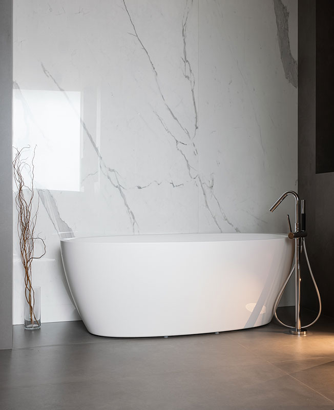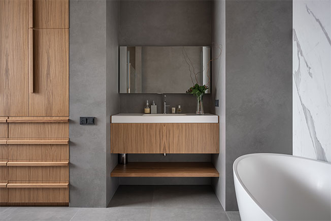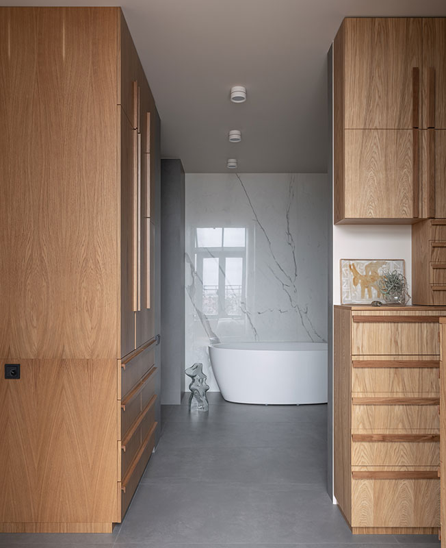 Ванная комната. Встроенная мебель изготовлена на заказ по эскизам автора проекта. Ванна Agape.