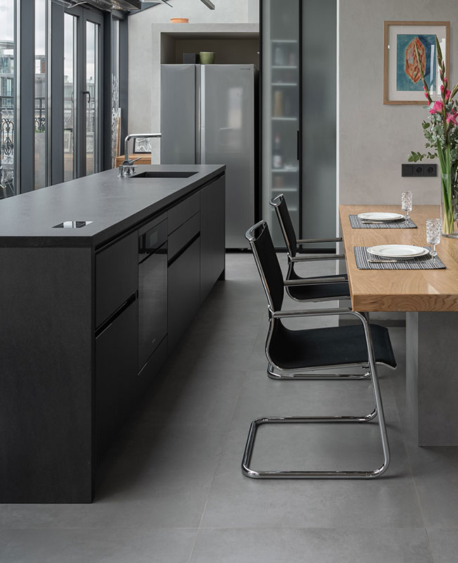 Кухня Leicht с интегрированной варочной поверхностью Ligron tech. На стене работа художника и архитектора Вячеслава Хомутова.