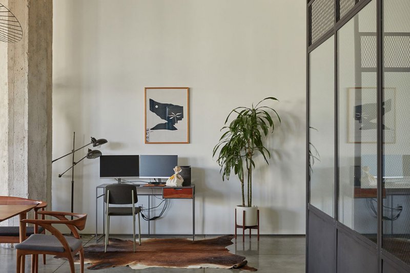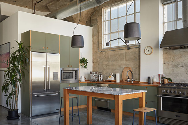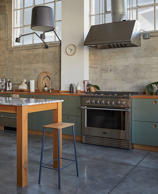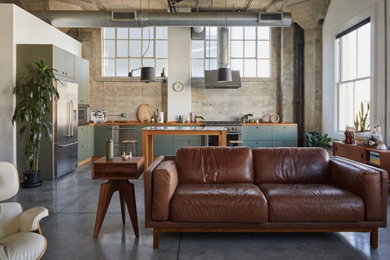 В лофте створчатые окна с двух сторон, белые стены и полированный бетонный пол, которые усиливают непринужденную атмосферу в «фабричном» пространстве. Теплые акценты смягчают индустриальный стиль — на кухне оливково-зеленый линолеум, а в центре комнаты высокие опорные колонны.