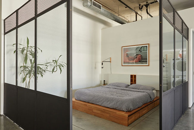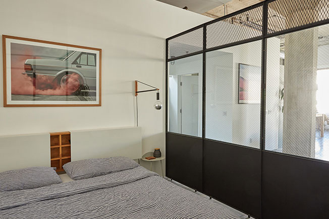 Спальня выделена лофт-перегородками из стекла и стали. В центре помещения — черный контурный подвесной светильник Vertigo, работа 2010 года нашей современницы, франуженки Констанс Гиссе; производит его компания Petite Friture.