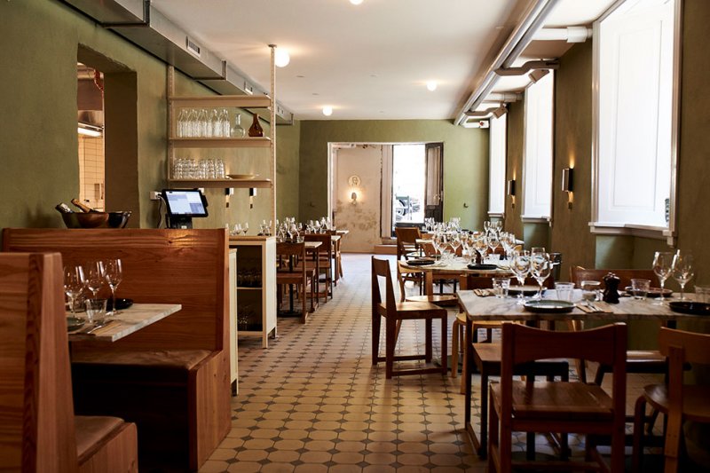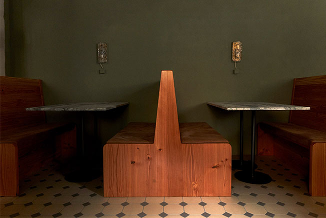 На мощеной площади Гробрёдреторв в Копенгагене появилось новое место для гастро-туристов. Местная дизайн-студия Frama оформила интерьер ресторана ближневосточной кухни Yaffa с атмосферой французского бистро: и все это — в столице Дании. Ресторан получил свое название в честь одного из главных портовых городов Древнего Израиля Яффа. Кухня поддерживает тему Ближнего Востока, также здесь предлагают множество блюд со средиземноморскими ингредиентами. Дизайн при этом нордический — суровый, наполненный авторскими предметами; функциональный и, несмотря ни на что, уютный. Дизайнеры сделали ставку на текстуры. Существовавшую бетонную отделку со своими шероховатостями и несовершенствами сохранили, освежив песочно-бежевой или болотно-зеленой краской. Образ поддержала и монолитная барная стойка, выкрашенная в янтарный, бледно-желтый, темно-синий, белый и другие цвета. Высокие стулья рядом — собственного производства студии Frama. Заказчики не хотели, чтобы интерьер выглядел слишком опрятным или чересчур новым. Один из приемов, который работает на эту задачу — использование разнообразных стульев. Вокруг обеденных столов, которые стоят довольно близко друг к другу в духе плотной французской посадки, дизайнеры расставили стулья Hongisto по дизайну знаменитого Илмари Тапиоваара и стулья «69» Алваро Аалто. Помимо барных, студия Frama добавила в интерьер также обеденные стулья Chair 01 собственного изготовления, выкрашенные вручную в орехово-коричневый цвет для придания «пожитого» вида. «Мы предусмотрели несколько типов посадки, некоторые из которых приватные, а другие полностью открыты», — рассказывает о проекте главный дизайнер студии Кассандра Брэдфилд (Cassandra Bradfield). Поэтому для больших групп гостей авторы придумали деревянные кабинки с уютным настенным освещением.