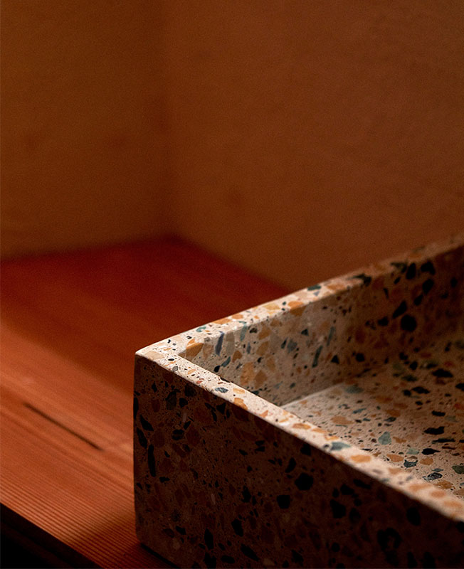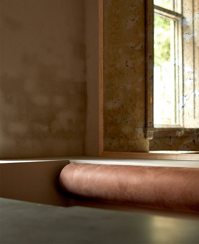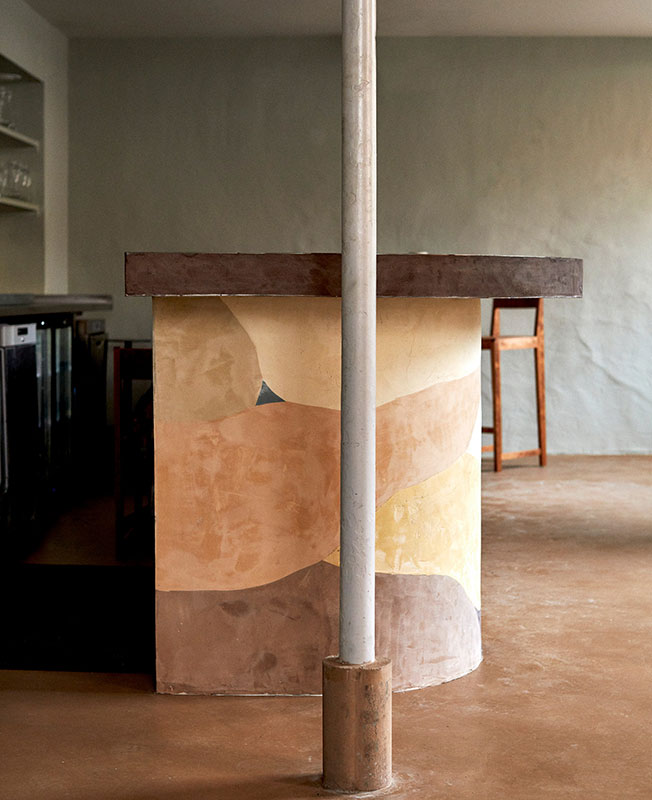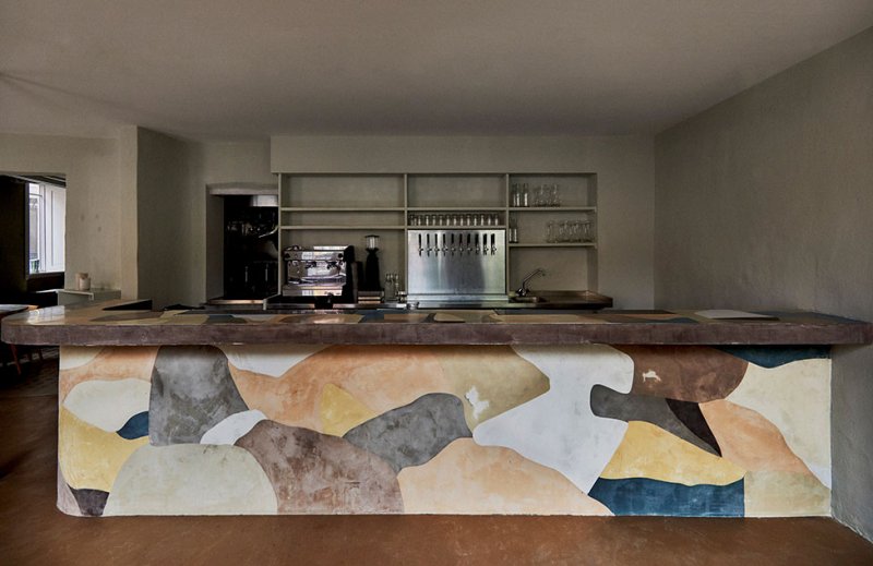 Дизайнеры сделали ставку на текстуры. Существовавшую бетонную отделку со своими шероховатостями и несовершенствами сохранили, освежив песочно-бежевой или болотно-зеленой краской. Образ поддержала и монолитная барная стойка, выкрашенная в янтарный, бледно-желтый, темно-синий, белый и другие цвета. Высокие стулья рядом — собственного производства студии Frama.