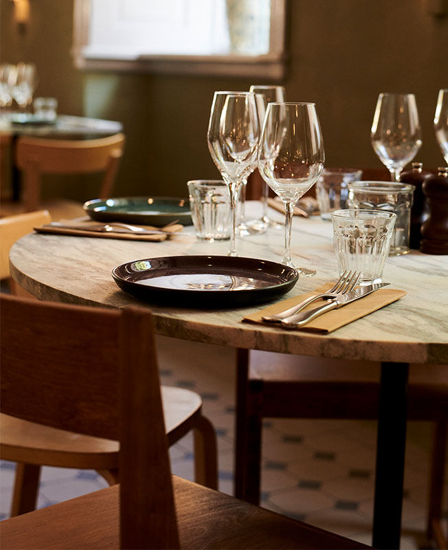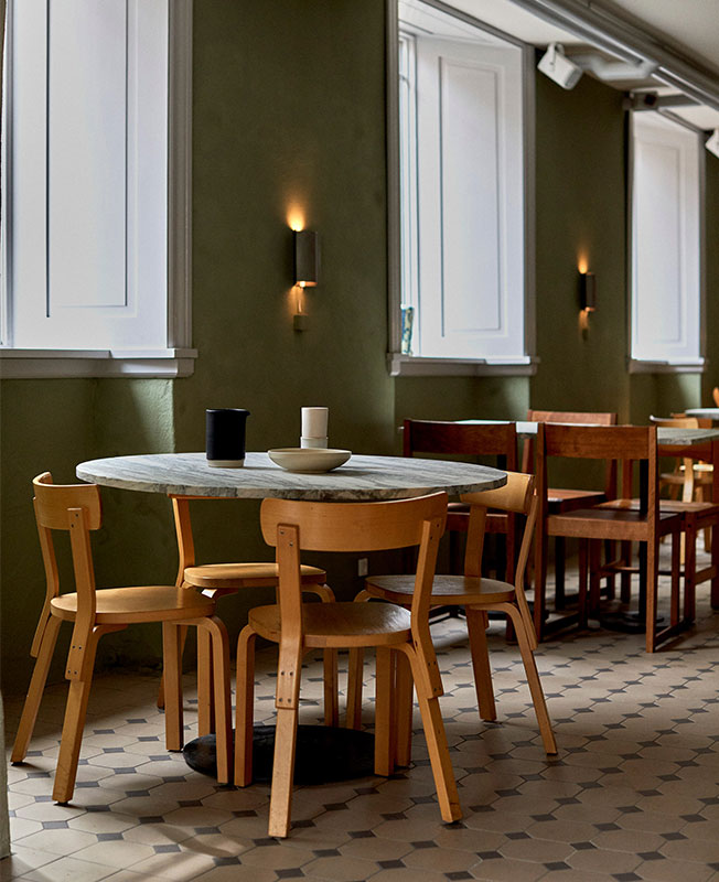 Заказчики не хотели, чтобы интерьер выглядел слишком опрятным или чересчур новым. Один из приемов, который работает на эту задачу — использование разнообразных стульев. Вокруг обеденных столов, которые стоят довольно близко друг к другу в духе плотной французской посадки, дизайнеры расставили стулья Hongisto по дизайну знаменитого Илмари Тапиоваара и стулья «69» Алваро Аалто.