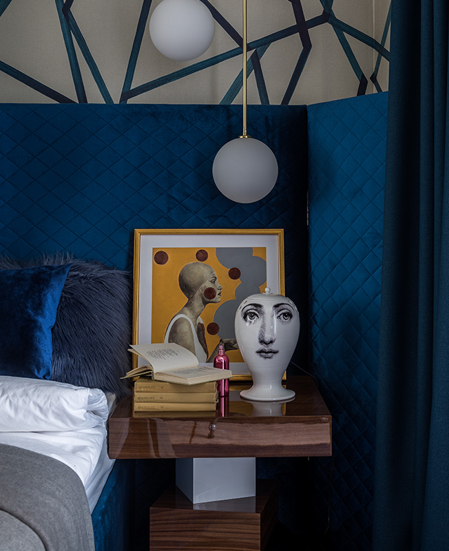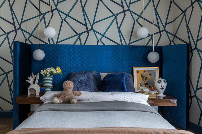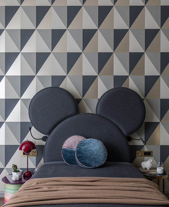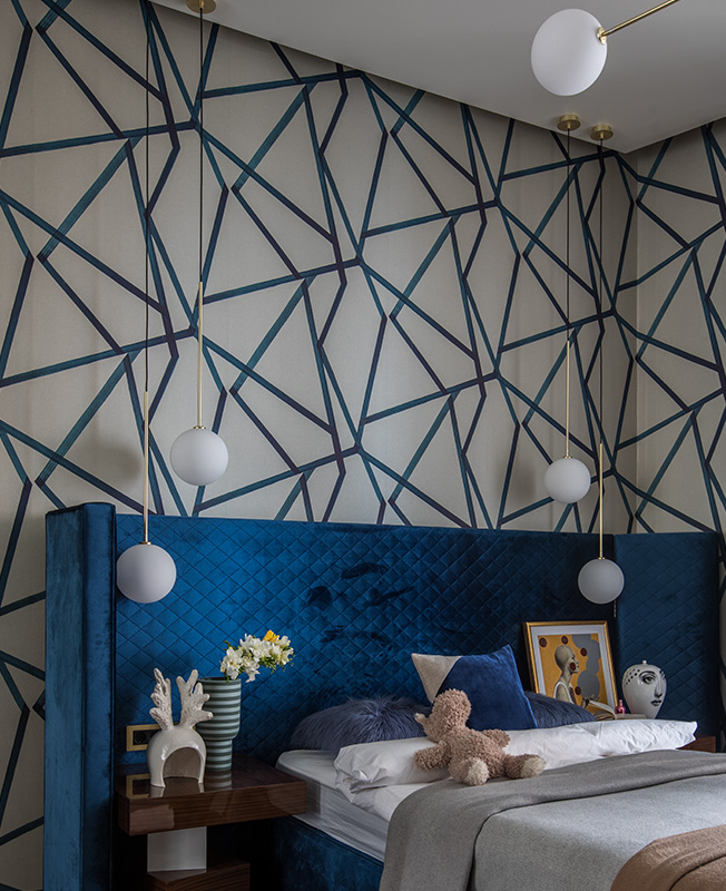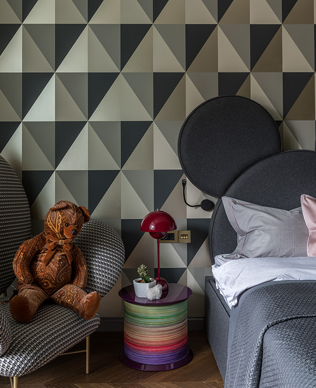 Комната старшей дочери. Обои Harlequin. Кровать по эскизам дизайнера изготовлена LoffiLab. Светильники Aromas. Ваза Fornasetti. Прикроватная тумба по эскизам дизайнера выполнена компанией Kvinton.