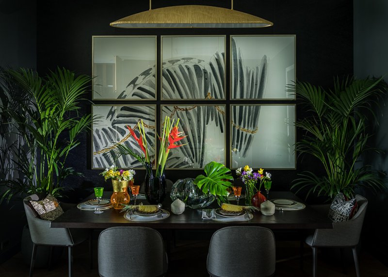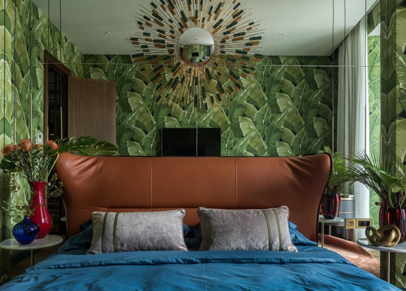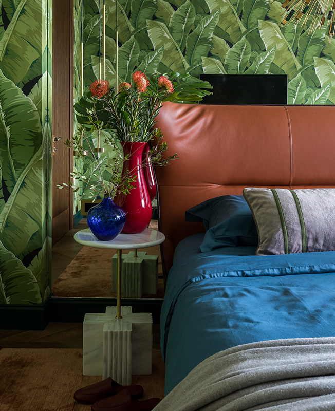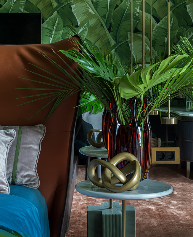 Когда есть надежная база, можно позволить себе свободу в декоре. Поскольку семья любит путешествовать и, как все жители Москвы, страдает от недостатка солнца, Анна создала яркую среду, напоминающую тропики. Теперь в семье есть шутка: «Меня нет. Я на Мальдивах» — это когда кто-то из домашних усаживается под пальмовые ветви на диване в гостиной. А обои с банановыми листьями в спальне помогают просыпаться по утрам.