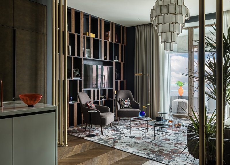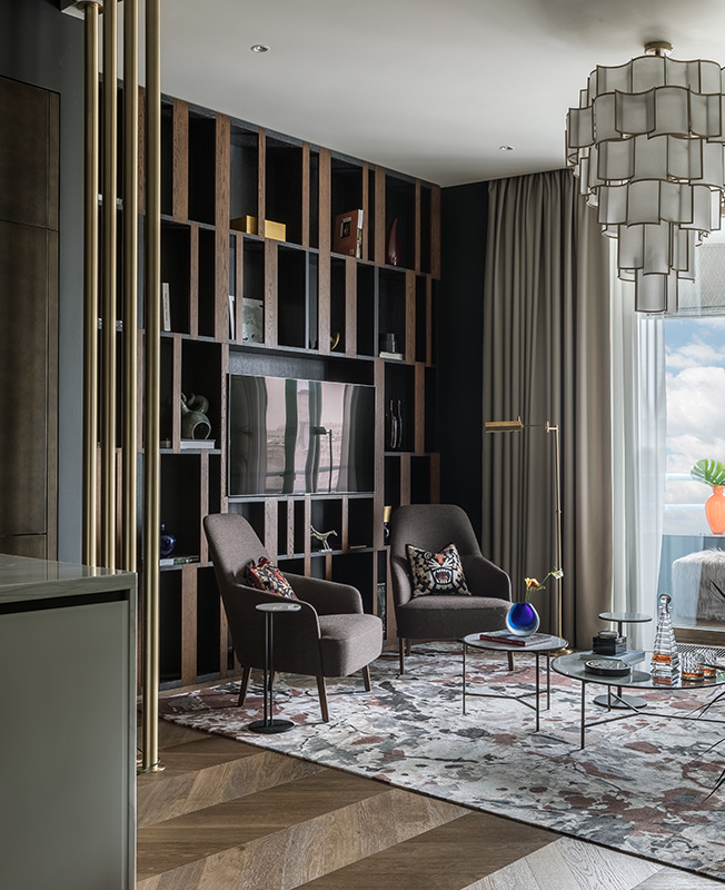 Гостиная. Кресла Wittmann. Столики Se Collections. Стеллаж и напольное покрытие по эскизам автора проекта: компания Kvinton. Люстра Officina Luce. Ковер Jerome Botanic. nonehttps://www.instagram.com/anplotnikova/?hl=runonewww.fabula-interiors.com