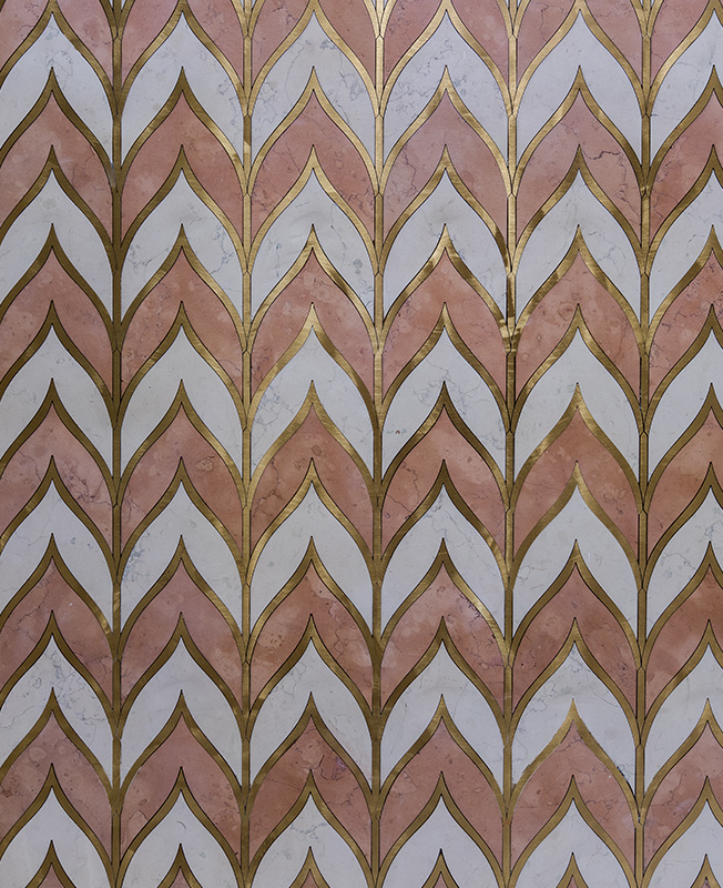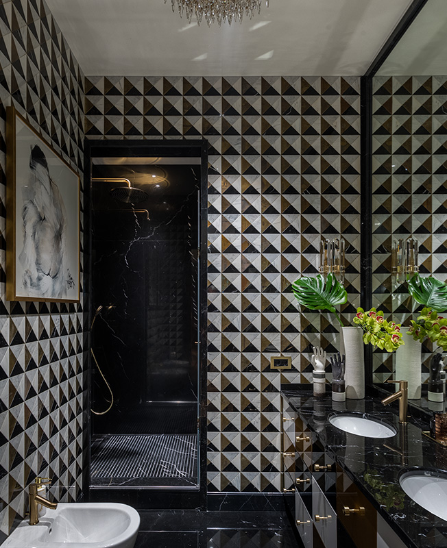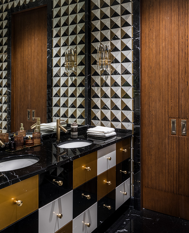 Ванная при главной спальне. Сантехника Villeroy & Boch. Смесители AXOR/Hansgrohe и Cia. Мозаика из трех видов мрамора с латунными вставками: мастерская Skystone.