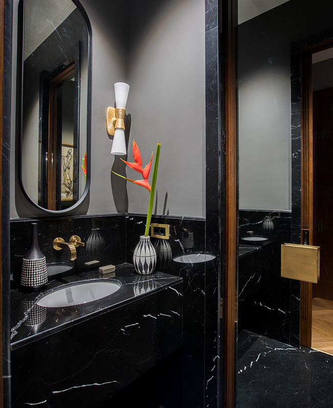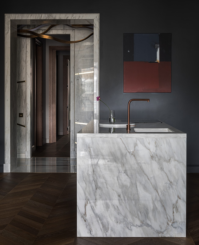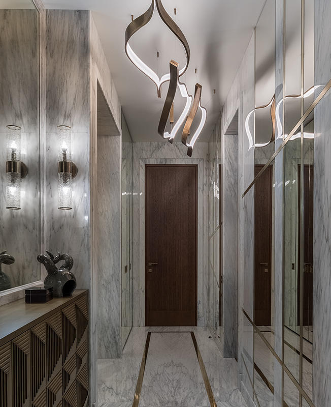 Прихожая. Подвесные светильники Henge. Бра Kelly Wearstler. Мраморное панно на стенах с зеркалами и латунью, облицовка стен и порталов, полы — все по эскизам дизайнера выполнено мастерской Skystone. Комод, зеркальный шкаф, двери и наличники: компания Kvinton.