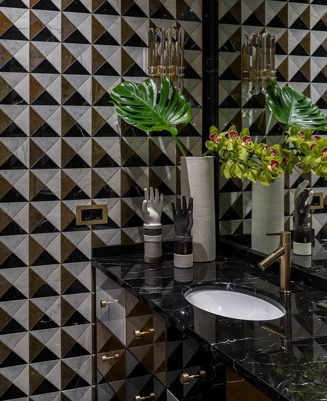 Детский санузел. Мраморная мозаика с латунными вставками: мастерская Skystone. Бра Kelly Wearstler. Тумба под раковины по эскизам дизайнера: компания Kvinton. Смесители AXOR/Hansgrohe и Cia. Сантехника Villeroy & Boch.