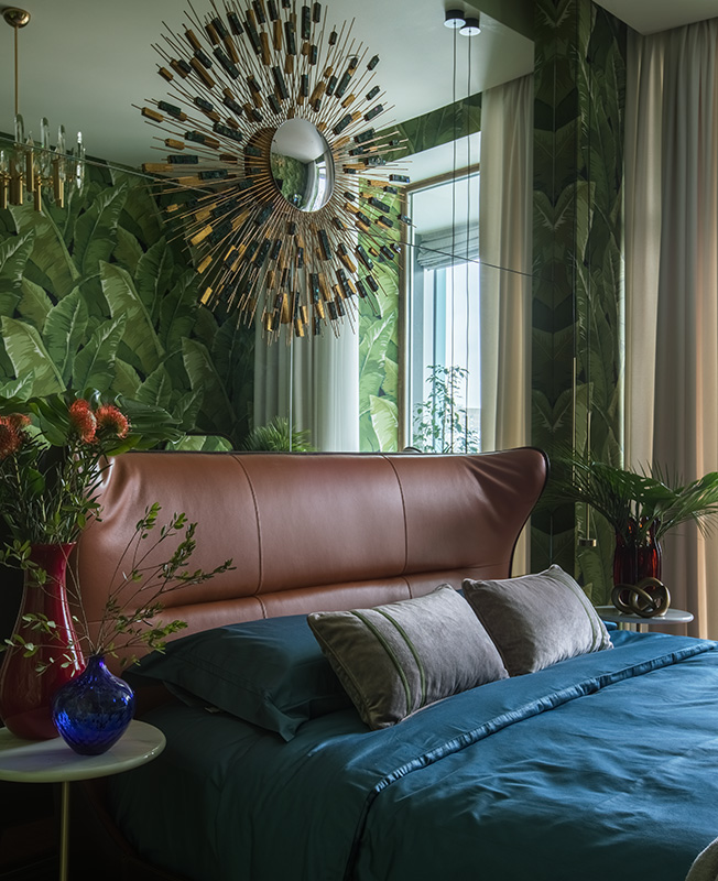 Главная спальня. Обои Jaima Brown, галерея Artique. Кровать Poltrona Frau. Столики, диз. Ольга Энгель. Прикроватные светильники Giopato & Coombes. Зеркало Christopher Guy. Люстра Sciolari, 1960.