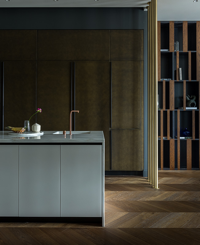 Опен спейс гостиной-кухни-столовой занимает 40 кв. м. Кресла Wittmann. Стеллаж и напольное покрытие по эскизам автора проекта выполнены компанией Kvinton. Очертания люстры Officina Luce согласуются с линиями стеллажа. Ковер Jerome Botanic. Кухня Valcucine. Cтолешница в мраморе Crema Delicato изготовлена в мастерской Skystone. Смеситель Cia. Мебель куплена в салоне Krassky.