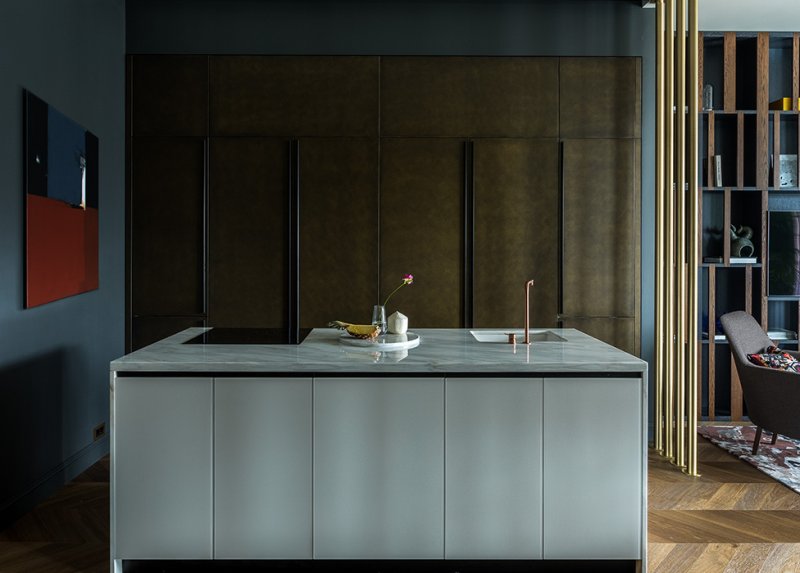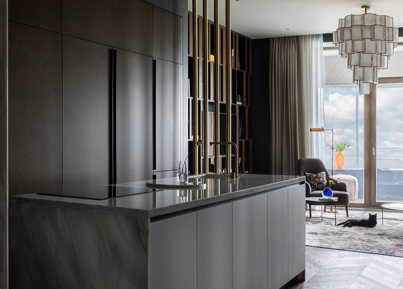 Опен спейс гостиной-кухни-столовой занимает 40 кв. метров. Кухня Valcucine. Cтолешница в мраморе Crema Delicato выполнена в мастерской Skystone. Смеситель Cia. Кресла Wittmann. Стеллаж и напольное покрытие по эскизам автора проекта изготовлены компанией Kvinton. Люстра Officina Luce. Ковер Jerome Botanic. Мебель куплена в салоне Krassky.