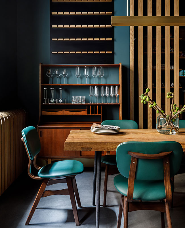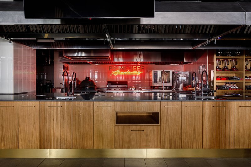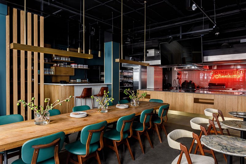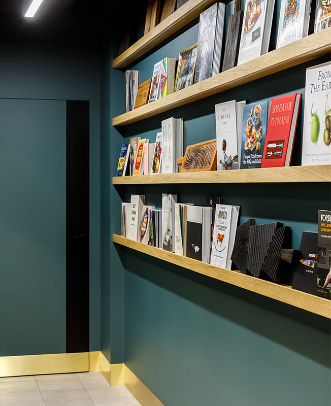 Наталья Маслова спроектировала интерьер кулинарного образовательного центра Primebeef Academy. Самое интересное, что Наталья уже работала на этом объекте ранее — три года назад дизайнер оформляла на этом месте ресторан «День». О проекте рассказывает автор. «Исходное пространство было мне хорошо знакомо: здесь долгие года размещались кафе и рестораны, один сменяя другой. Видимо, тихий переулок немного в стороне от Сретенки не слишком подходит для заведений. При этом для Primebeef Academy места лучше не придумаешь — в окна не заглядывают любопытные прохожие, но при этом обеспечена близость к центру. Клиенты долго искали помещение, примерно шесть месяцев. И когда, наконец, они позвонили и сказали, что нашли идеальное место и назвали адрес, я сказала, что нам даже не потребуются замеры, у меня уже все есть — я там когда-то работала. Хотелось, чтобы «Академия» была похожа скорее на модный современный бар, чем просто на кулинарную школу в привычном представлении. Заказчики хотели стильный, яркий, модный и запоминающийся интерьер. Что касается цветовой палитры, я всегда ищу подсказку в самих клиентах — внимательно слежу за их гардеробом на встречах. Колористическое решение пришло не сразу — мы подбирали варианты, но что-то было не так. И когда заказчик пришел на очередную встречу в рубашке сложного сине-зеленого цвета, я поняла, что это оно. Единственное, что пришлось переосмыслить полностью — это зонирование помещения. Кухня полностью открыта — это сердце заведения и центр всеобщего внимания. Пространство для гостей не стали делить на маленькие залы и разобщать посадку. Хотелось наоборот объединить и сплотить посетителей, например, за одним большим обеденным столом. Старые перегородки сломали, пространство сделали максимально открытым. Но при этом у заведения есть отдельные зоны — ресепшен, он же бар, кухня для проведения мастер-классов, станция шеф-повара, вспомогательная кухня для заготовок, гостевой зал с центральным столом и диванами со столиками для напитков, а также хозяйственная комната — все это на площади 120 кв. метров. Примечательные объекты интерьера — обеденные столы Дениса Милованова, которые гармонично вписались в общую концепцию. Вокруг них мы расставили винтажные датские стулья 1950-х годов. Вся остальная мебель была изготовлена на заказ по нашим эскизам в столярной мастерской Владимира Кубышина: диваны, барная стойка, кухонный остров, шкафы, стеллажи в зоне ресепшн и весь декоративный свет.