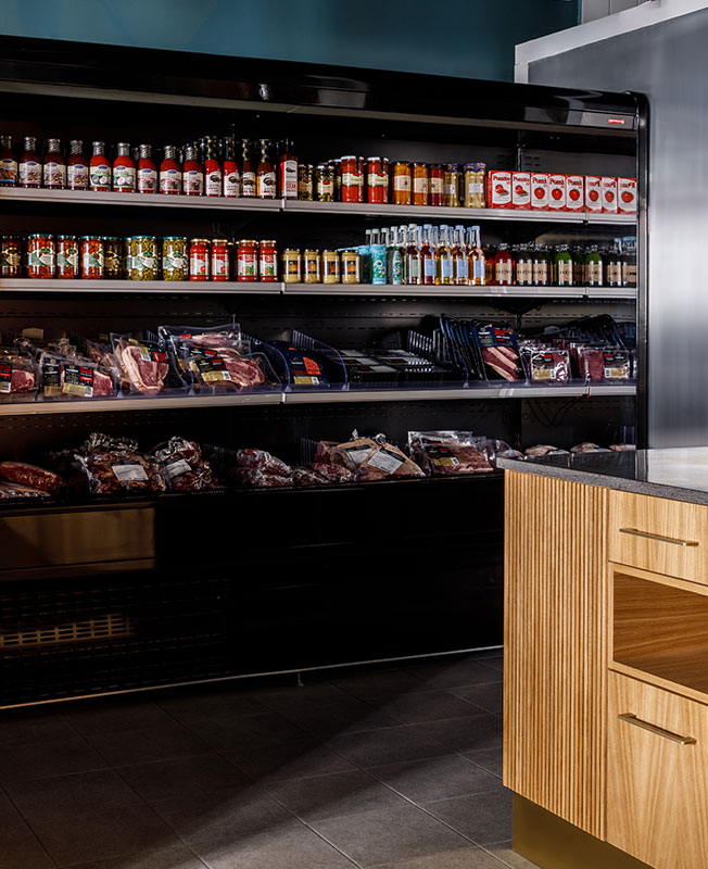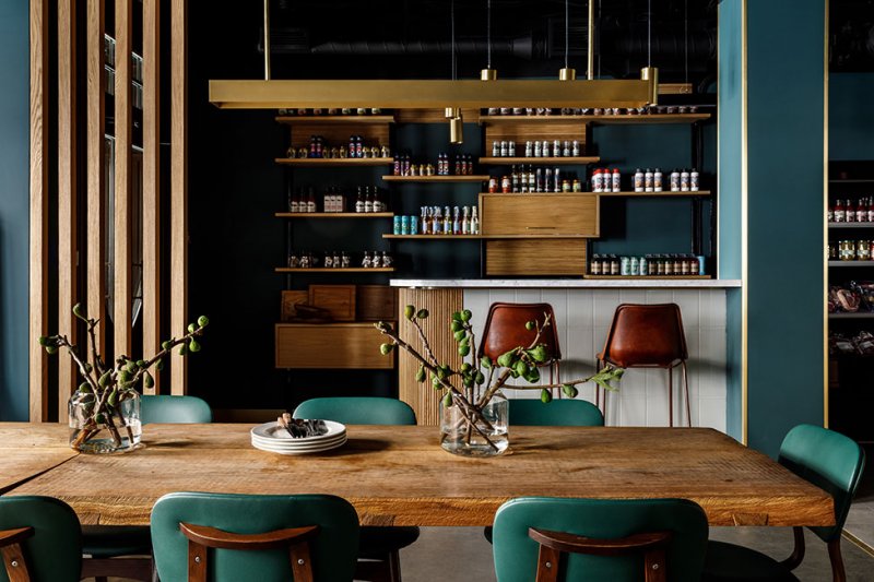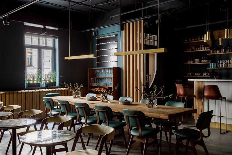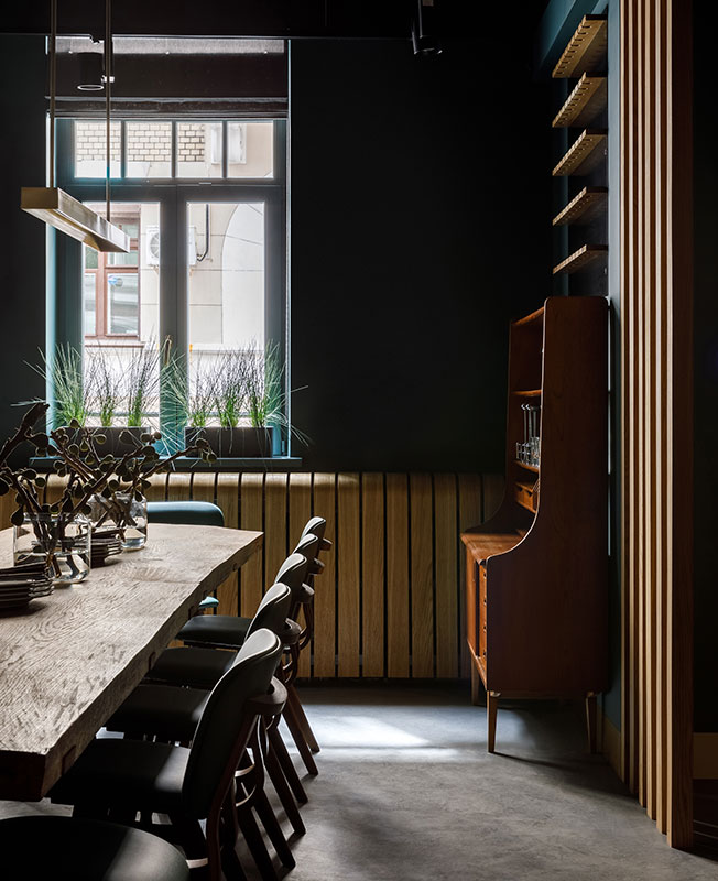 Единственное, что пришлось переосмыслить полностью — это зонирование помещения. Кухня полностью открыта — это сердце заведения и центр всеобщего внимания. Пространство для гостей не стали делить на маленькие залы и разобщать посадку. Хотелось наоборот объединить и сплотить посетителей, например, за одним большим обеденным столом.