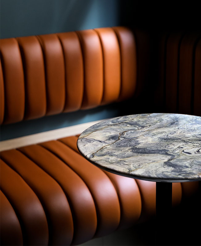 Примечательные объекты интерьера — обеденные столы Дениса Милованова, которые гармонично вписались в общую концепцию. Вокруг них мы расставили винтажные датские стулья 1950-х годов. Вся остальная мебель была изготовлена на заказ по нашим эскизам в столярной мастерской Владимира Кубышина: диваны, барная стойка, кухонный остров, шкафы, стеллажи в зоне ресепшн и весь декоративный свет.