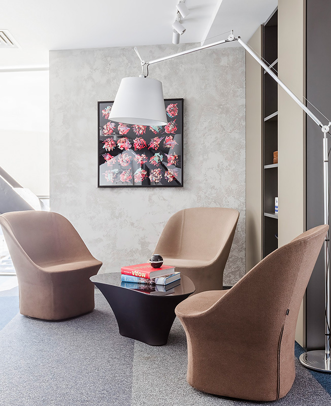 Что же касается мебели для сотрудников, то в дополнение к ранее купленной была приобретена аналогичная — от итальянской фабрики LAS. В лаундж-зонах представлены предметы от Pianca, Ligne Roset, Cattelan Italia.