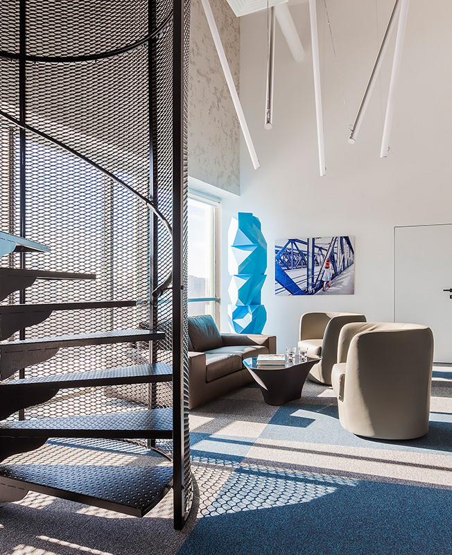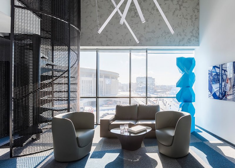 Палитра лаконична. «Лофт всегда предполагает использование черного металла. Белый для нас — цвет чистоты, мы используем его во всех проектах. Синий ковролин объединяет интерьер, наполняя его цветом. А элементы из тонированного стекла теплого бронзового оттенка придают ему уют. Важная деталь — декоративный свет. Длинные световые трубки формируют скульптурные акценты».