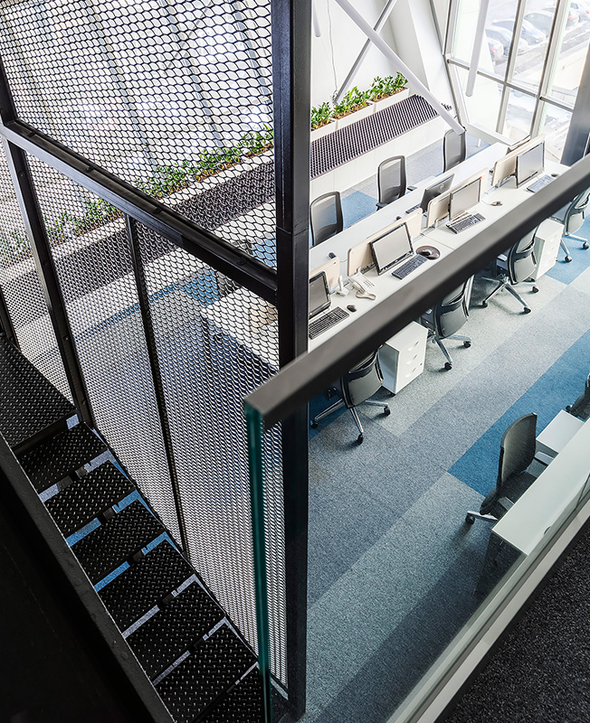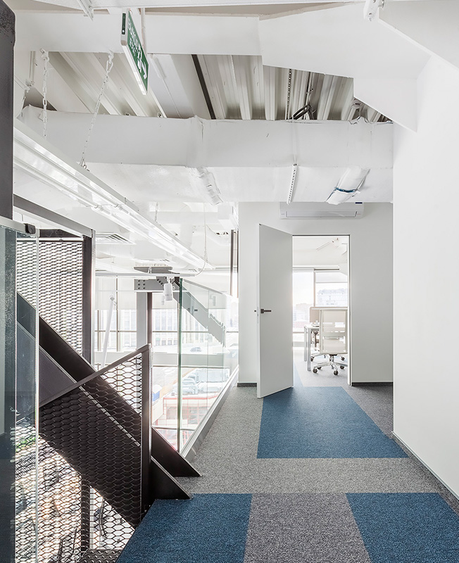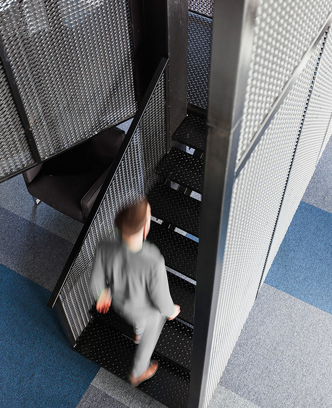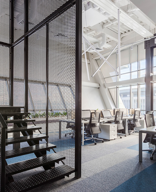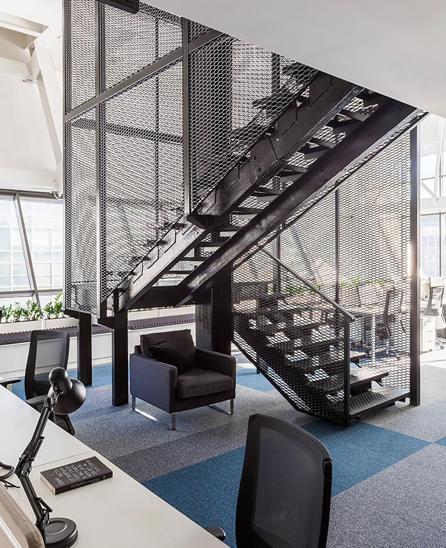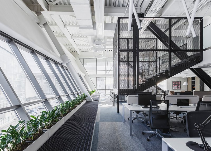 Исходник находился в состоянии shell & core — предстояло возвести абсолютно все, включая стены и антресоли. «Большая редкость, когда в офисах нам удается работать с настолько интересными по форме и объему помещениями. Невероятно высокие потолки и панорамное остекление позволили разделить объем на два уровня. Наклонная стена рабочей зоны и металлические опорные конструкции продиктовали настроение и стилистику», — рассказывают архитекторы.