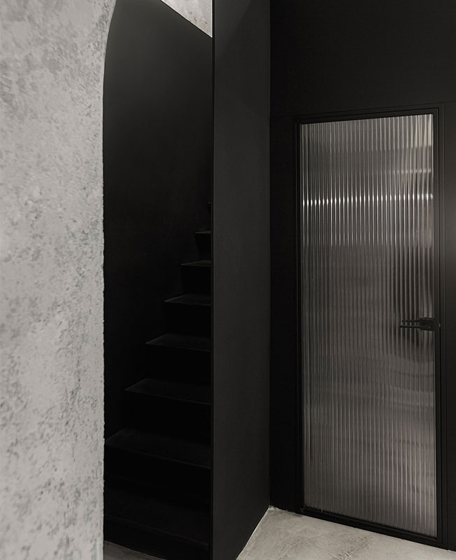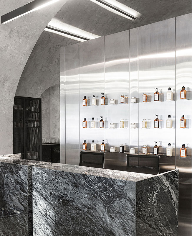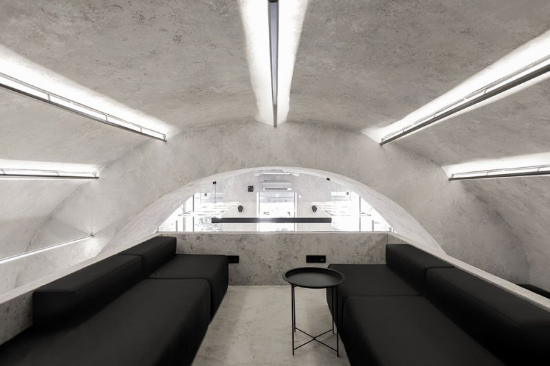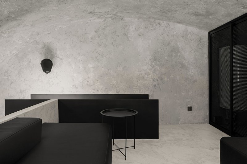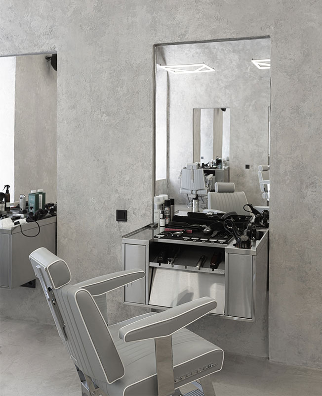 Дизайнеры сосредоточились на материалах, выбрав достаточное смелое сочетание мрамора, нержавеющей стали и бетона. Стены выровняли и покрыли декоративной штукатуркой, разработанной специально для нас. Зону отдыха оборудовали на антресоли — здесь разместили диваны и небольшое техническое помещение.