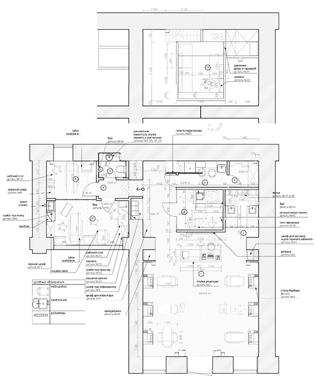«Мы не хотели делать очередной барбершоп в лофте с потрепанным кирпичом, фотографиями хипстеров и дизайнерскими клише», — рассказывают о проекте Дмитрий и Иванна. Необходимо было разместить рабочие места для мастеров, а также заказчик хотел добавить тату-салон, зону педикюра для мужчин и женщин, а также пространство для отдыха.