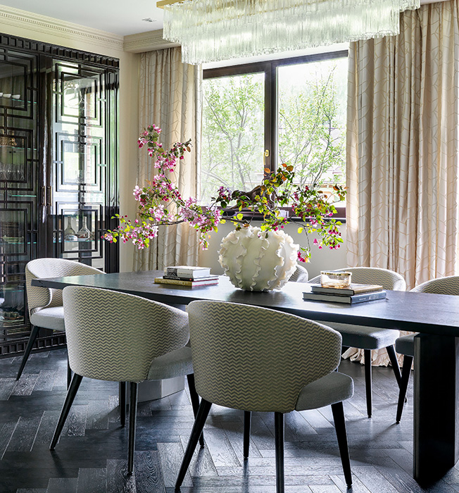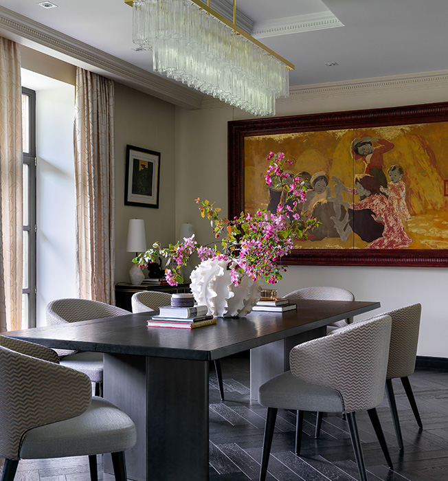 Зона столовой. Стол и стулья Minotti. Люстра: Bella Figura Шкаф для посуды: дизайн Виктории Скляренко, изготовление Mrs Rubi.