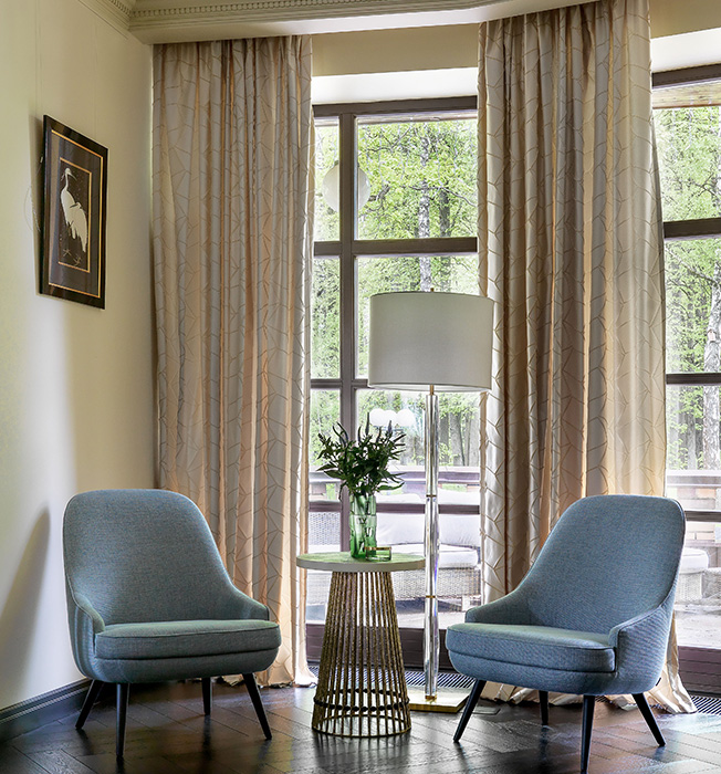 У окна устроили приятный уголок для отдыха. Кресла Molteni&C, cтолик Theodor Alexander. Торшер Visual Comfort.