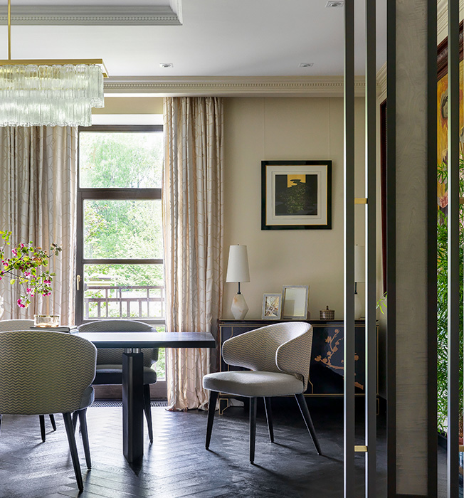 Гостиную дизайнеры отделили от столовой перегородками с вращающейся внутренней частью и вставкой из сикаморы. «Выбор тонировки отнял много времени, заказчица настаивала на темном оттенке, в конце концов мы нашли компромис: затонировали поверхность в два разных цвета, темно-коричневый и серый. Вращая полотно, цвет можно менять по настроению».